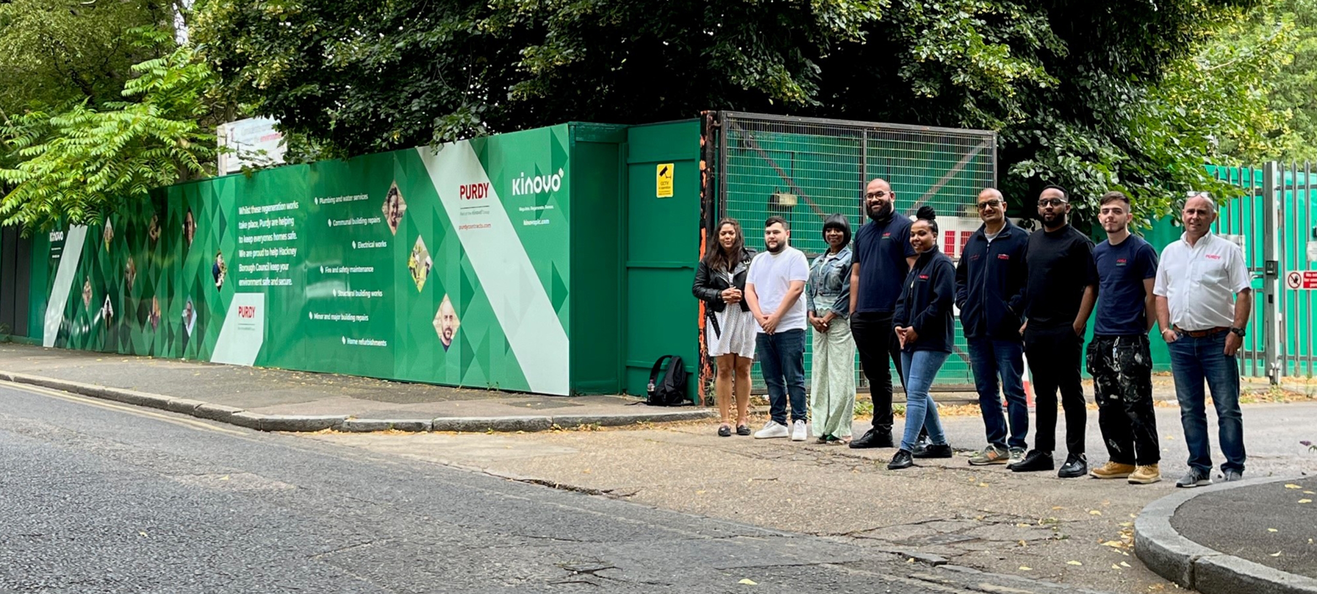 In June last year Purdy’s parent company rebranded and changed its name to Kinovo, hence the Kinovo/Purdy branded hoarding. The name Kinovo was derived through a series of workshops that included our employees; “kin” relates to family; our people, our subsidiaries, our clients and communities. It also forms part of the word “kinetic”; a type of motion that gains more energy as it accelerates. The word “novo” is from the Latin word meaning to make new. Combined, Kinovo reflects a renewed family with connected competence as its core.”